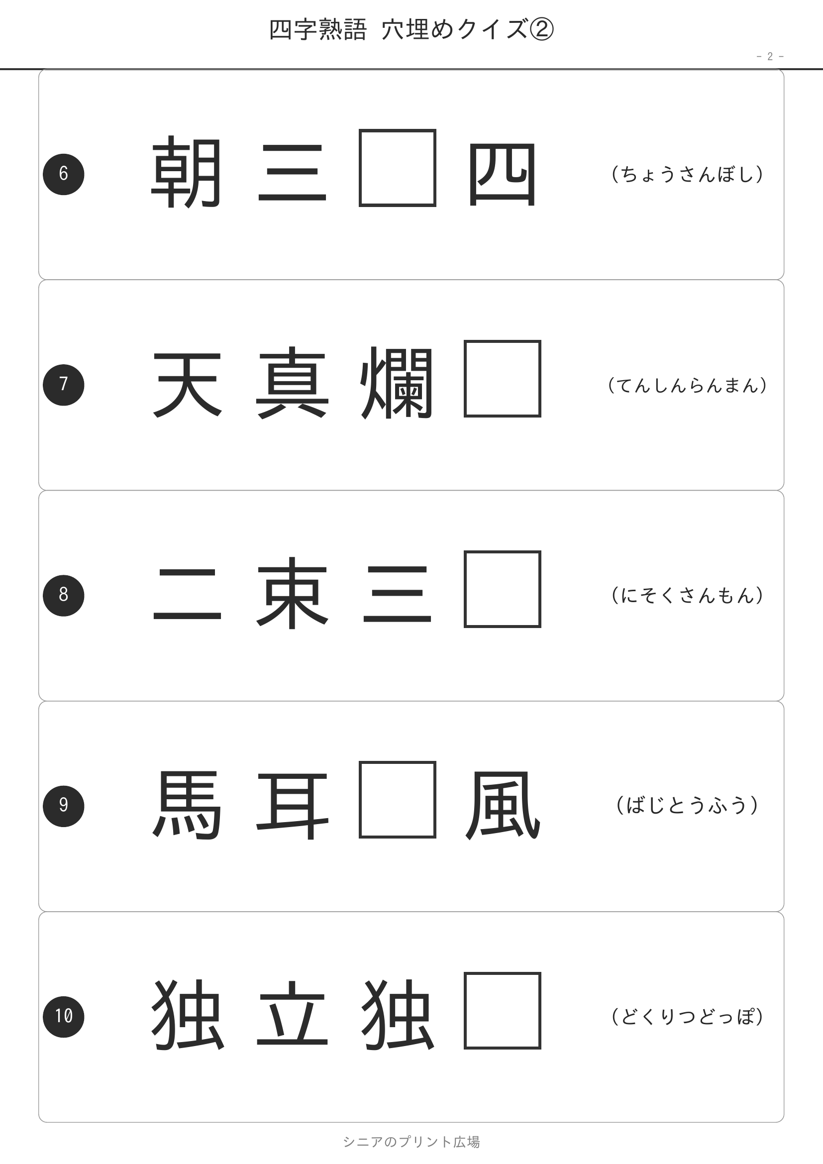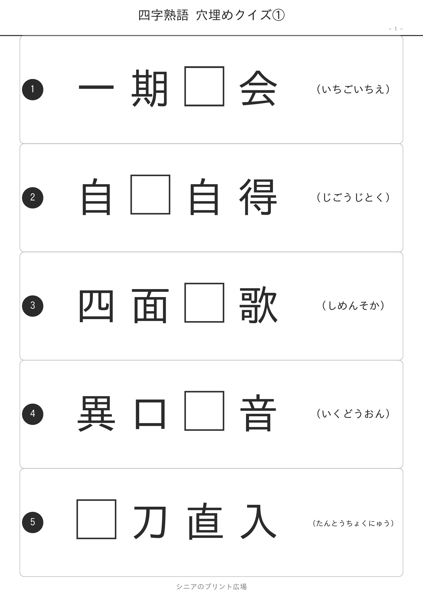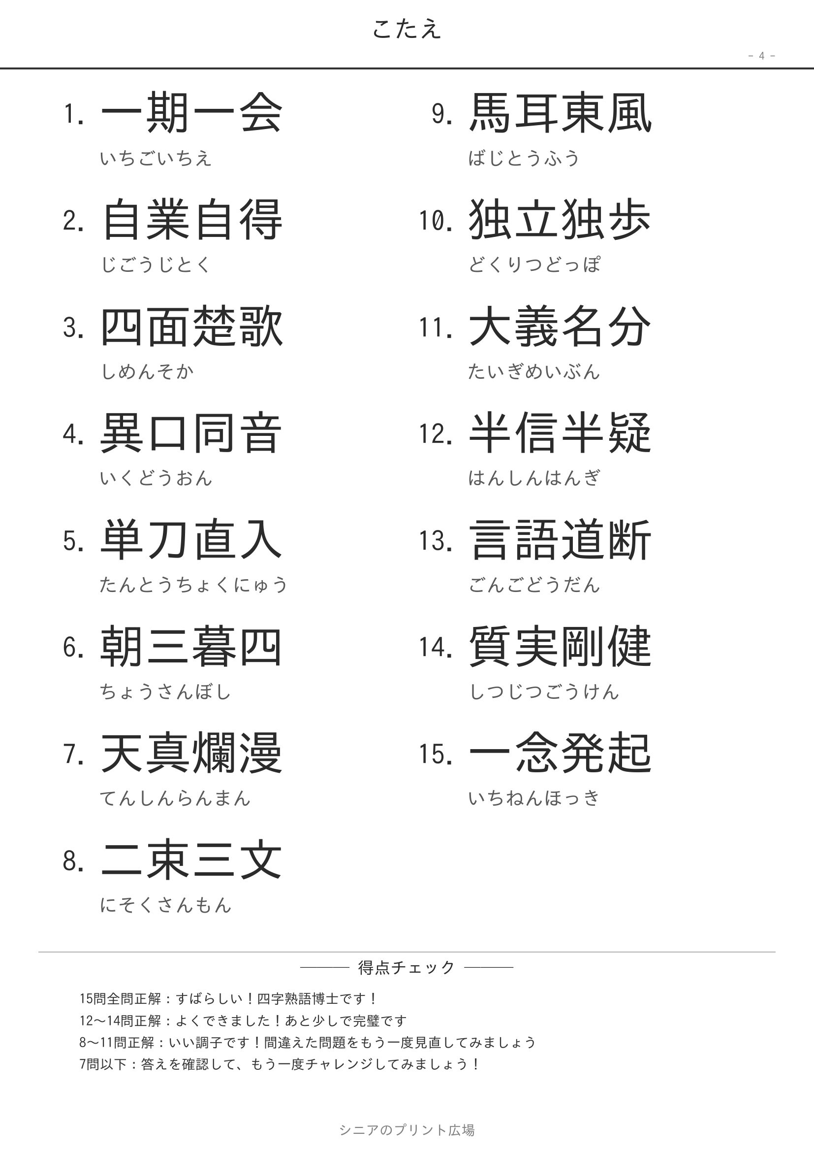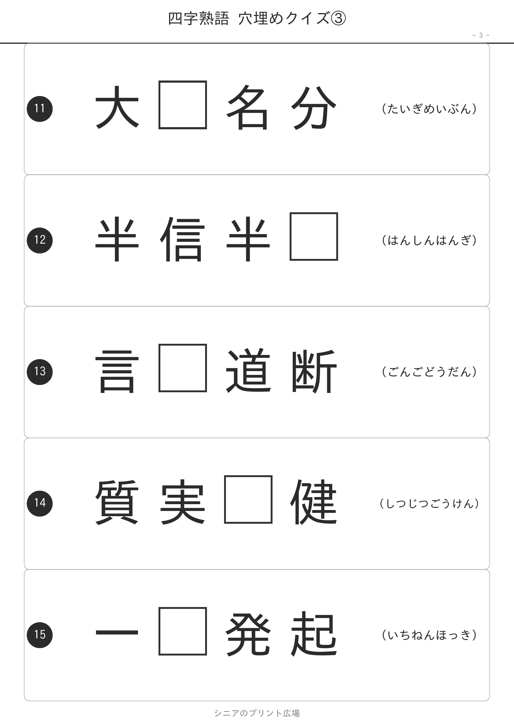 四字熟語の穴埋め問題・高齢者向けの無料プリントです。ふつう難易度の全15問を収録しています。印刷してすぐ使えます。デイサービスや介護施設のレクリエーションにもご活用ください。